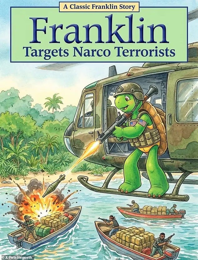 An AI generated cartoon from Secretary of Defense Pete Hegseth that he posted on “X” in response to war crime accusations. Franklin is a character from books and an animated TV series for young children . Apparently, the Secretary has nothing better to do than to “own the libs.”